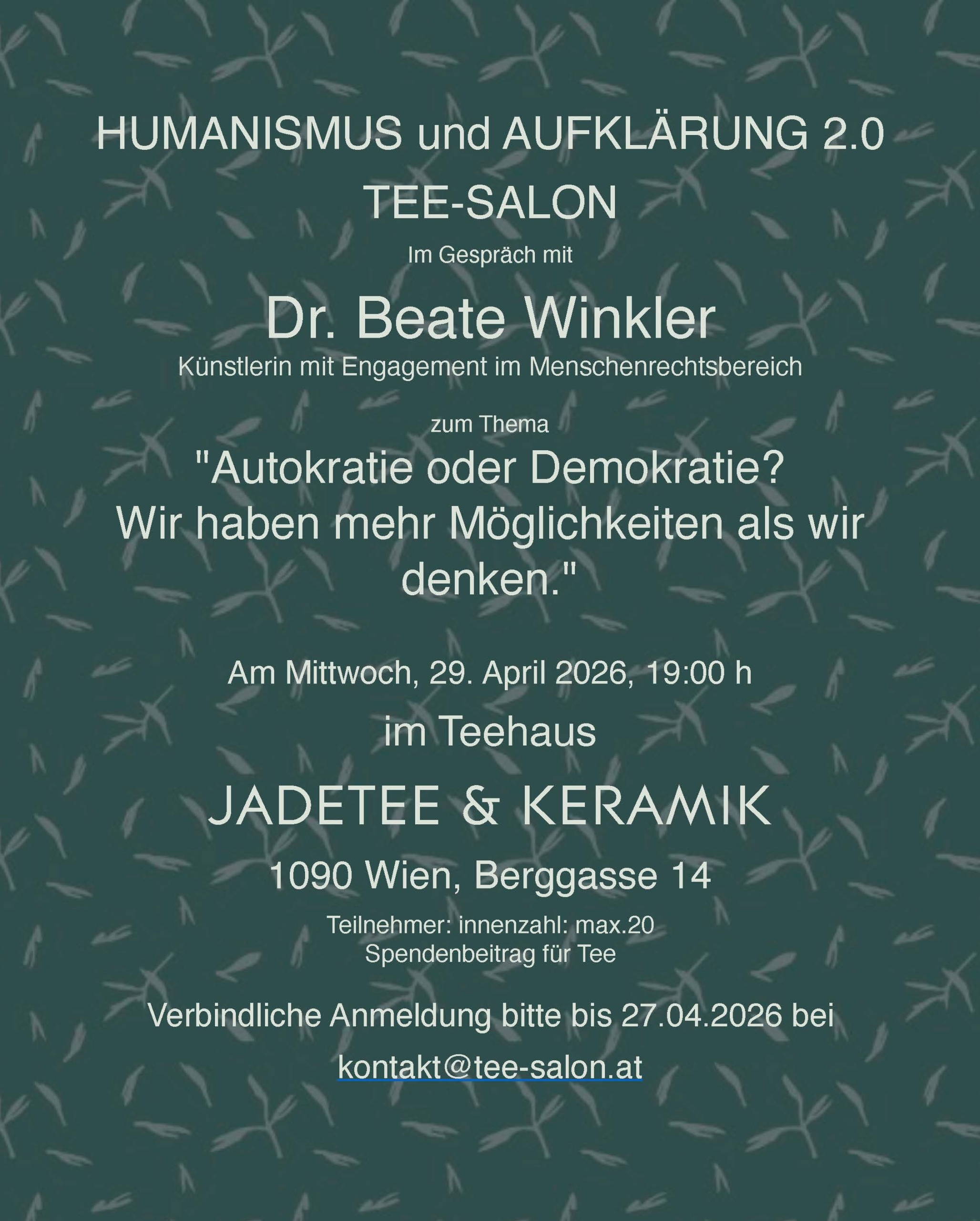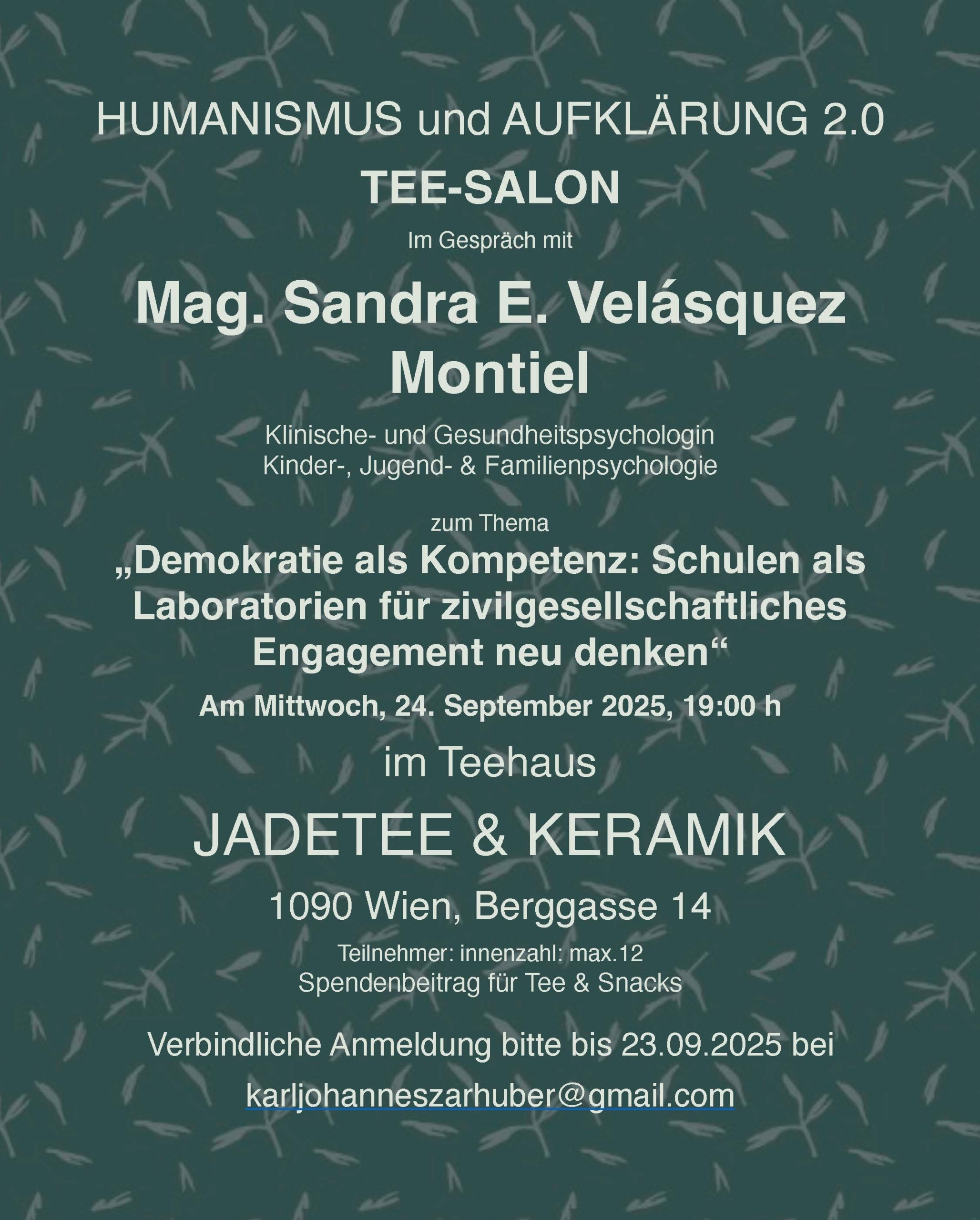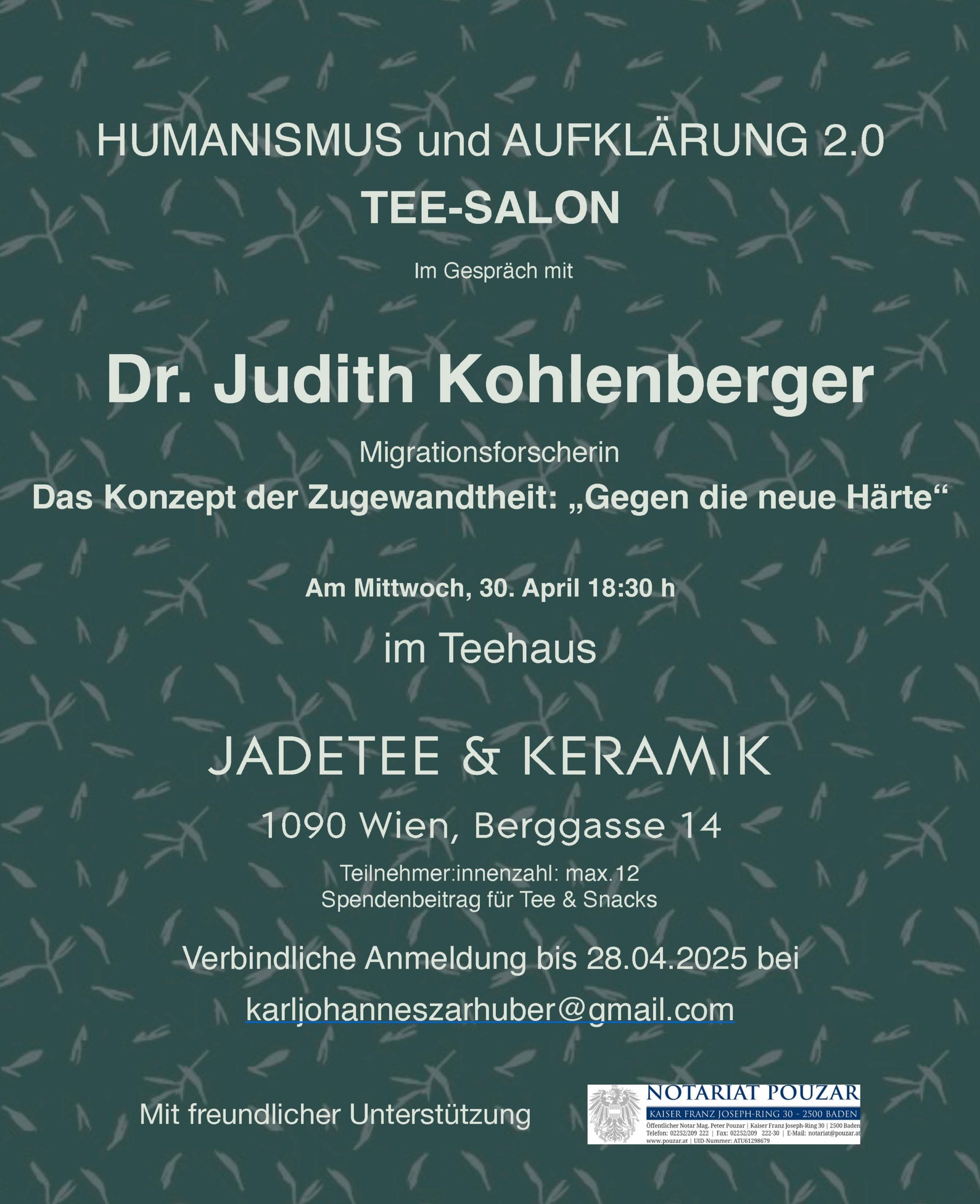 Für jeden TEE-SALON laden wir eine vortragende Person ein, die aus ihrer jeweiligen Perspektive und Expertise ein Thema auswählt, das Zugang zur Umsetzung von Werten in unserer lokalen, regionalen, nationalen und globalen Gesellschaft ermöglicht.